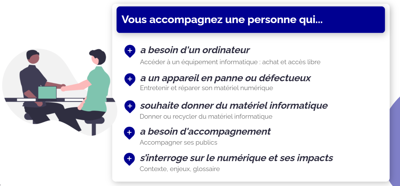 • des cartographies des points de vente solidaire de matériel informatique reconditionné et d'accès à du matériel en libre service (bibliothèques, espaces publics numériques, tiers-lieux…)