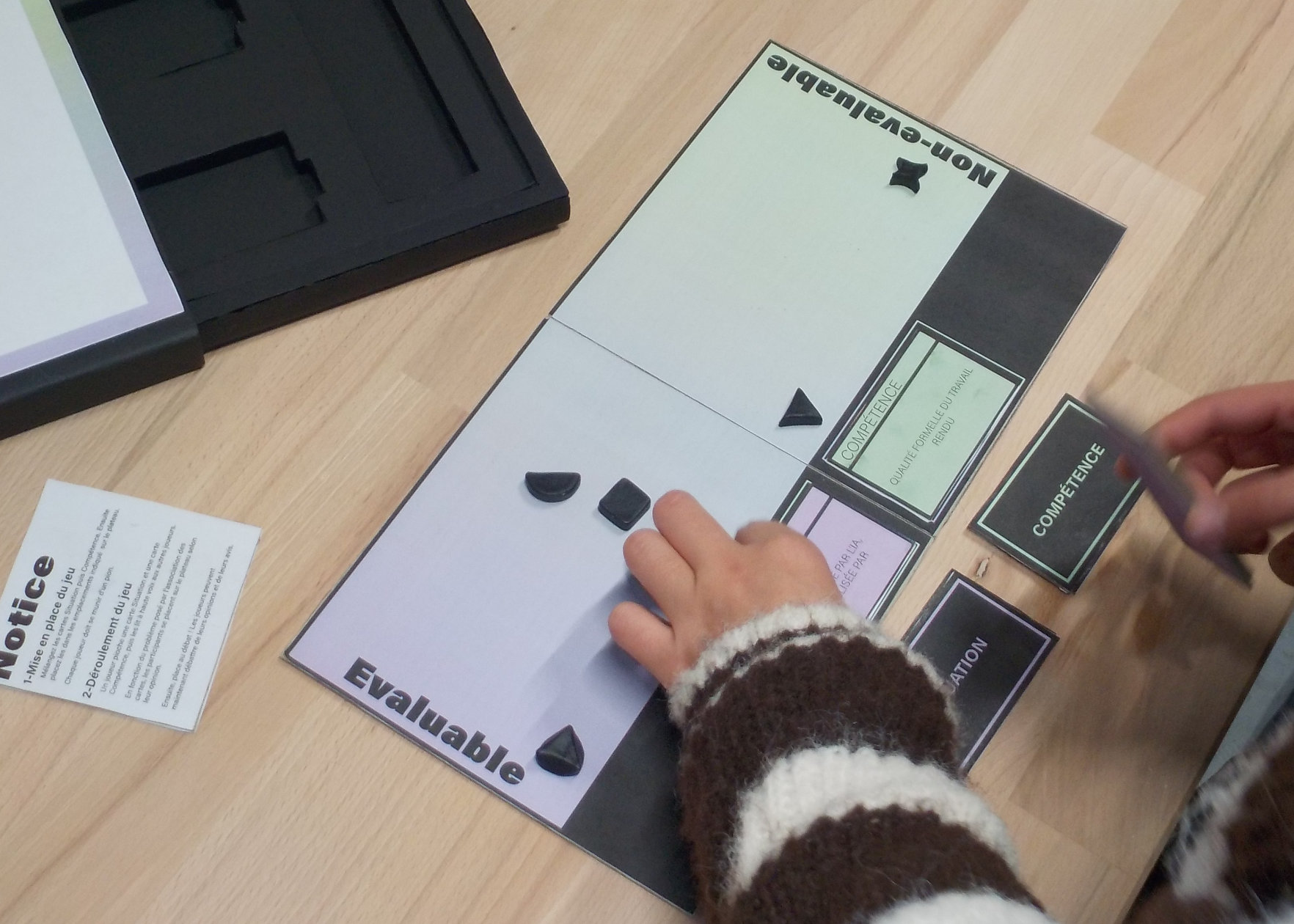 Le plateau de jeu est une jauge qui permet de se positionner entre Évaluable et Non-évaluable. Les joueur·euses choisissent un pion qui les représente, puis pioche une carte Situation qui traduit le contexte de l’utilisation de l’IA dans un travail scolaire et une carte Compétence qui définit la compétence qui doit être évaluée. Enfin, les participant·es se positionnent et débattent ensemble.