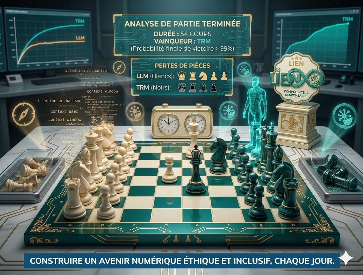 TRM : "Dis-moi LLM en tant que maître des échecs est-tu en capacité de confirmer que l'image générée est la reproduction exacte du plateau de jeu à la fin d'une véritable partie disputée en 54 coups ?"