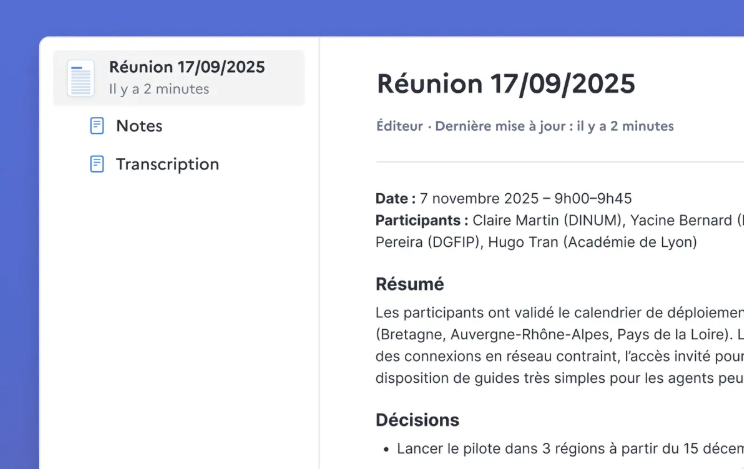 Transcription automatique : Visio peut générer une transcription complète des échanges, avec identification claire des interventions, ce qui facilite la relecture et le repérage des points importants.