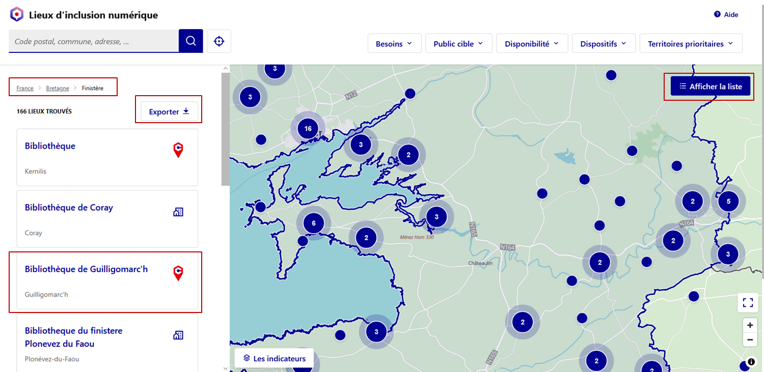 La carte se recentre sur la zone sélectionnée et les lieux de médiation existants s'affichent.
