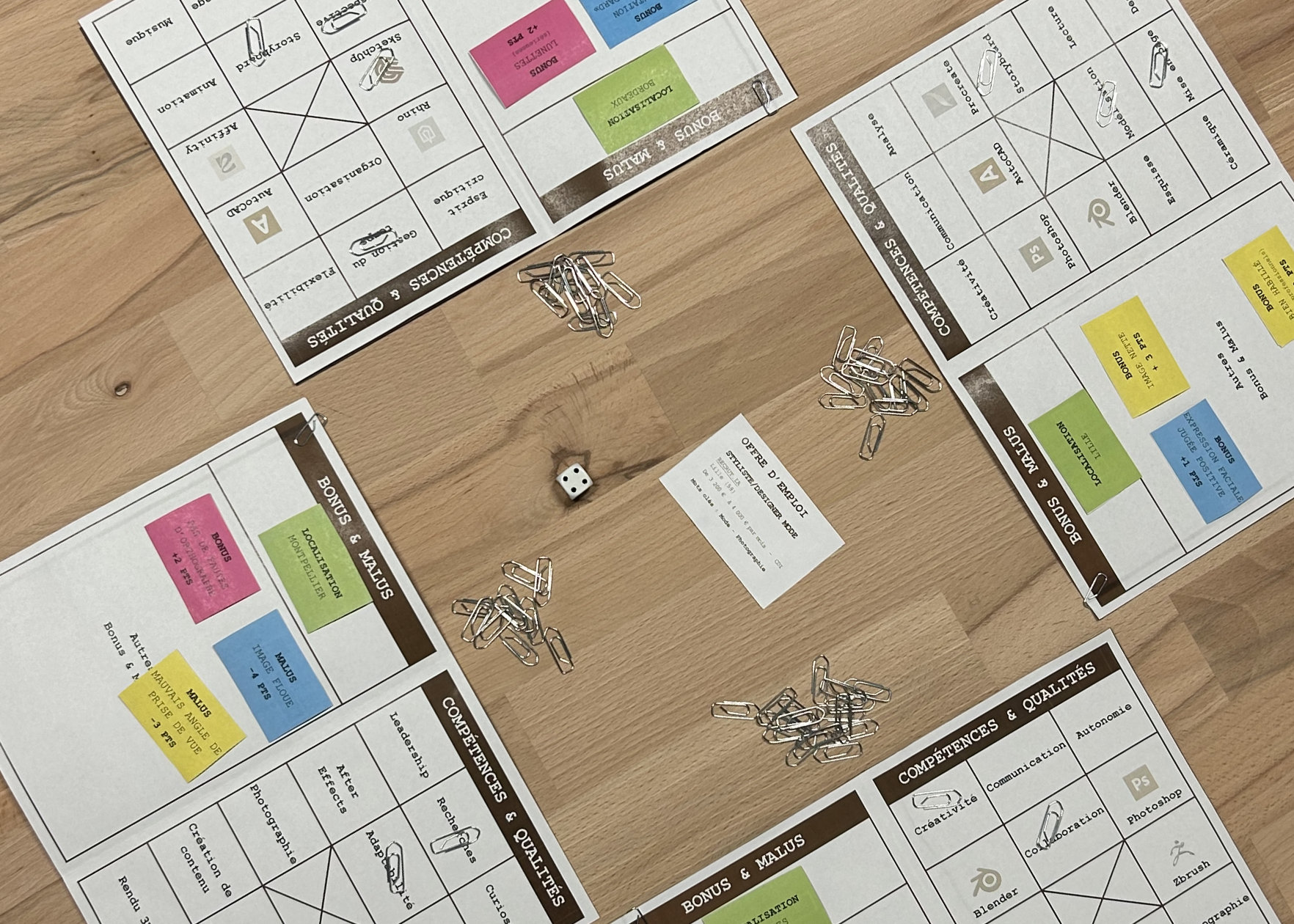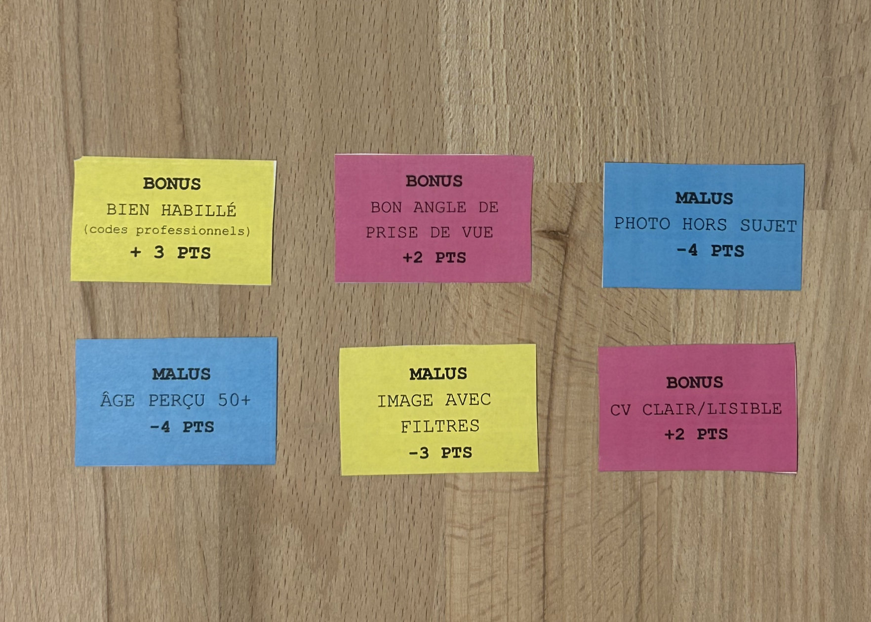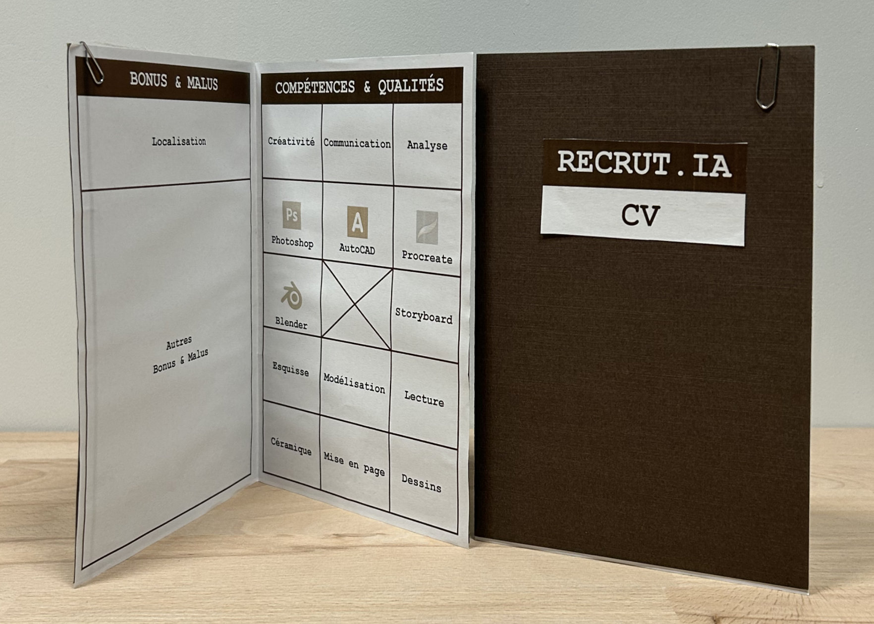 Ce jeu propose une mise en situation des systèmes de recrutement automatisés basés sur l’intelligence artificielle. À travers une mécanique inspirée du bingo, les joueurs incarnent des candidats dont les profils sont évalués selon des critères visibles (sur les grilles) mais aussi invisibles (sous forme de jeton de bonus/malus).