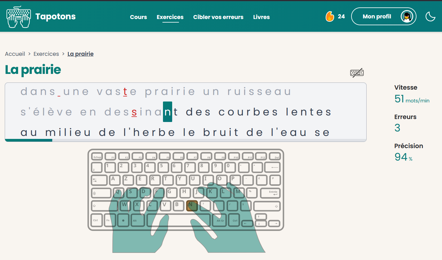 Apprenez la dactylographie en ligne avec Tapotons : cours 10 doigts, exercices interactifs, test de vitesse de frappe et statistiques sur clavier AZERTY.